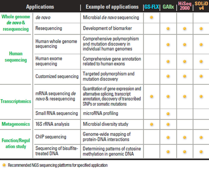 We provide Next generation sequencing (NGS) with a variety of platforms (GS-FLX Titanium, SOLEXA GA IIx, SOLEXA HiSeq 2000, ABI SOLiD v.4).